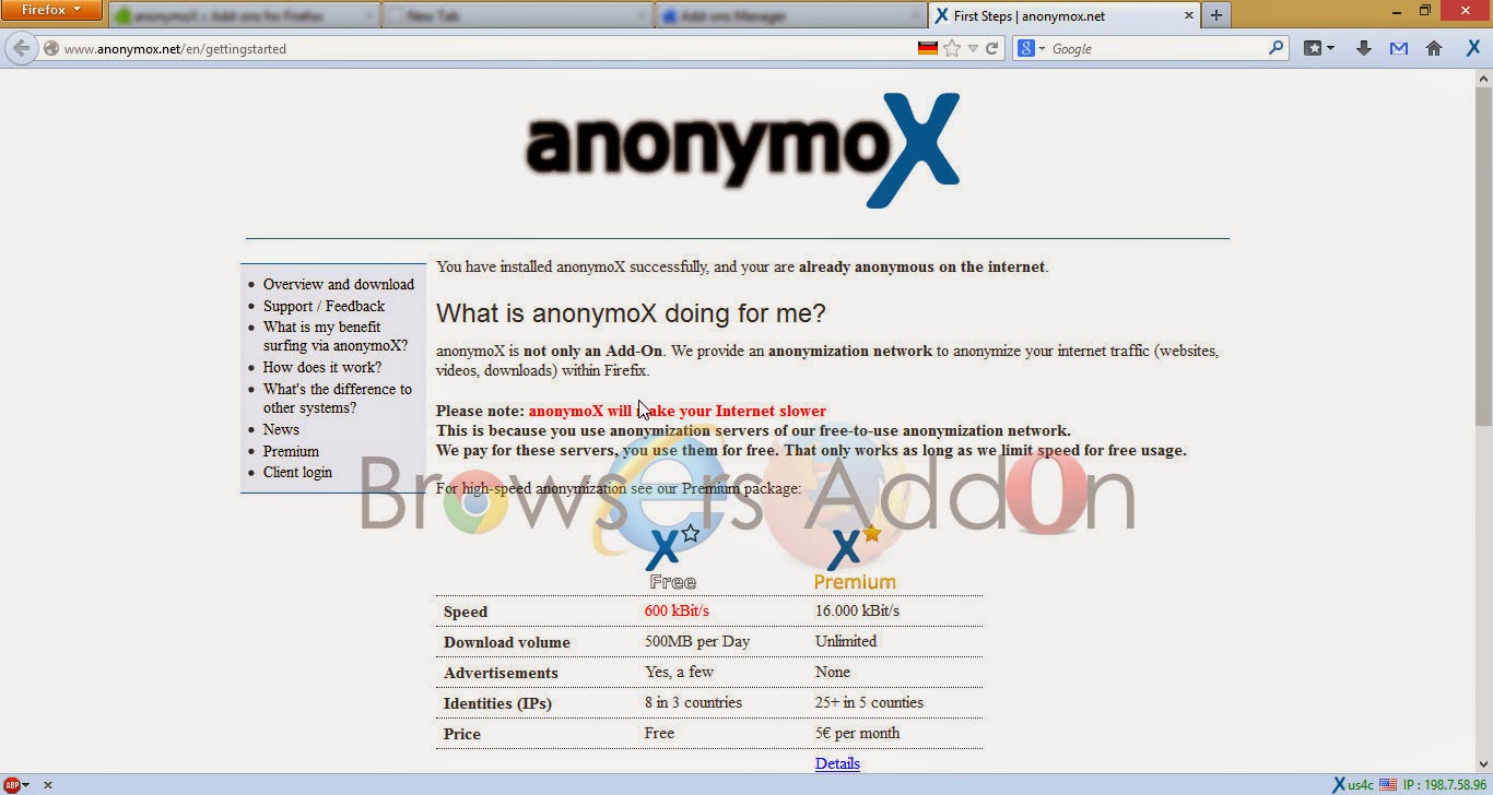 1. On successful installation, you will be asked to restart firefox, after restarting you will redirected to anonymoX starting page which shows what is anonymoX, how is works and its model.2. At down, in add-ons bar, you can notice that anonymoX has been assigned a new IP address to you Firefox browser.